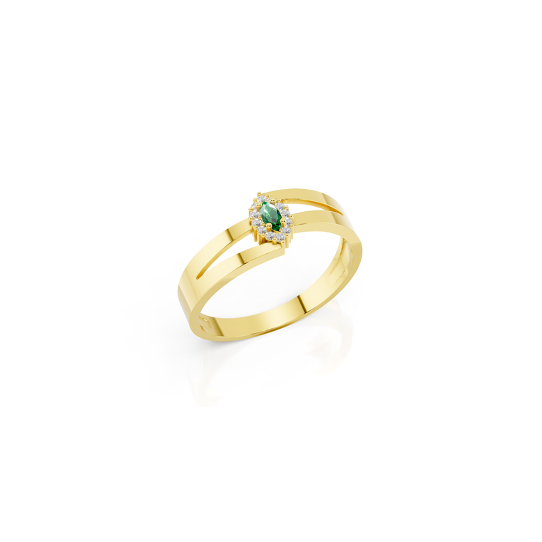 Simboliza os caminhos paralelos que se unem no sucesso da graduação. Inspirado na fluidez das linhas modernas, o Anel Horizonte Real apresenta uma estrutura geométrica em ouro que valoriza a pedra central em formato navete. Este corte específico é um dos mais clássicos da joalheria.