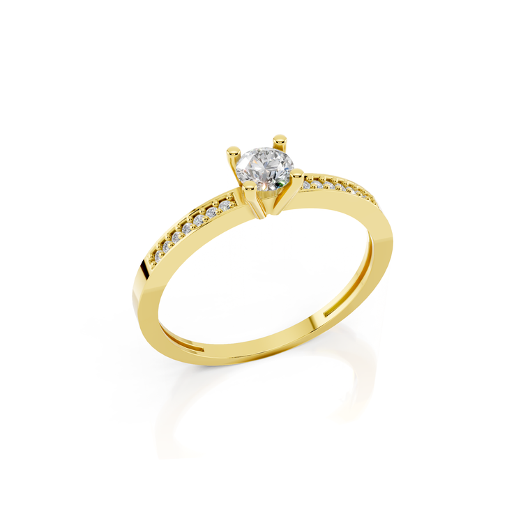 Uma joia que equilibra a imponência do ouro 18K com a delicadeza de um brilho infinito. Este solitário apresenta um design exclusivo, onde o aro se projeta em direção à pedra central, conferindo uma estética fluida e sofisticada.
